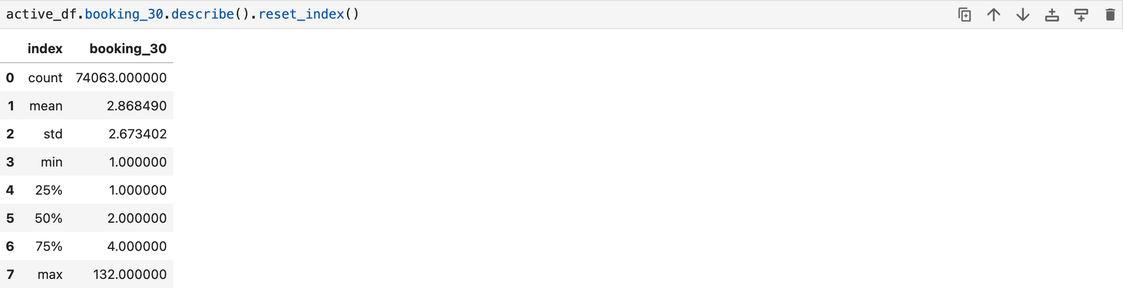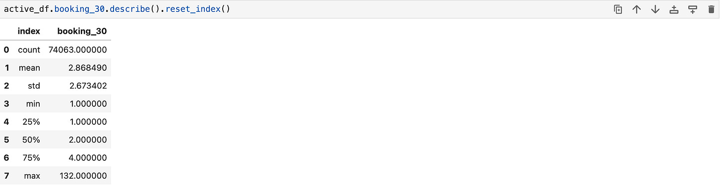 active_df = segment_df[segment_df.booking_30>0].reset_index(drop=True)Now, let’s use the .describe() function to see how our users’ 30 day bookings look like: