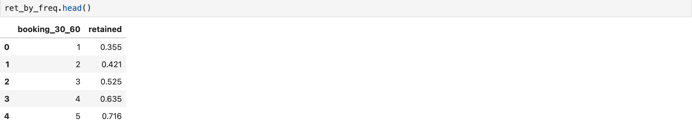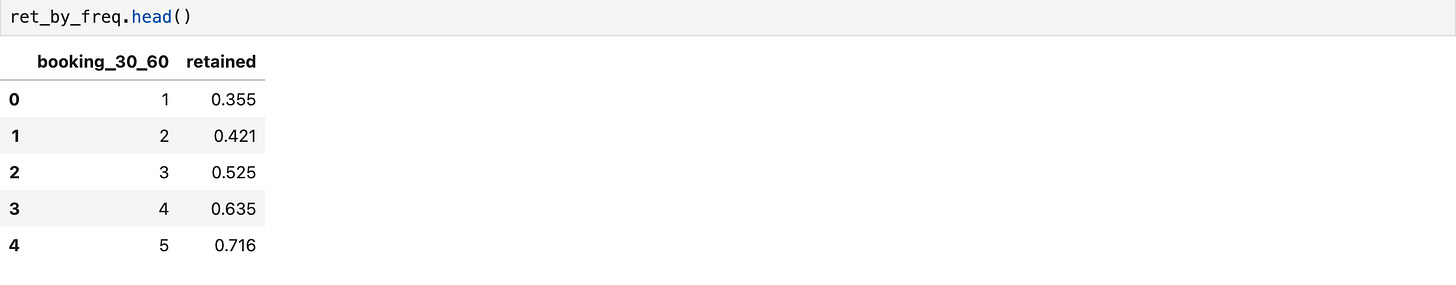 active_60_df.loc[active_60_df.booking_30 > 0, 'retained'] = 1The dataframe above now has all the active users in a 30-60 window and a field called retained to tell us if that particular user has retained it. Now, we will create another dataframe to use in our retention by frequency chart. That chart will show us the retention of the users based on how many bookings they have made.