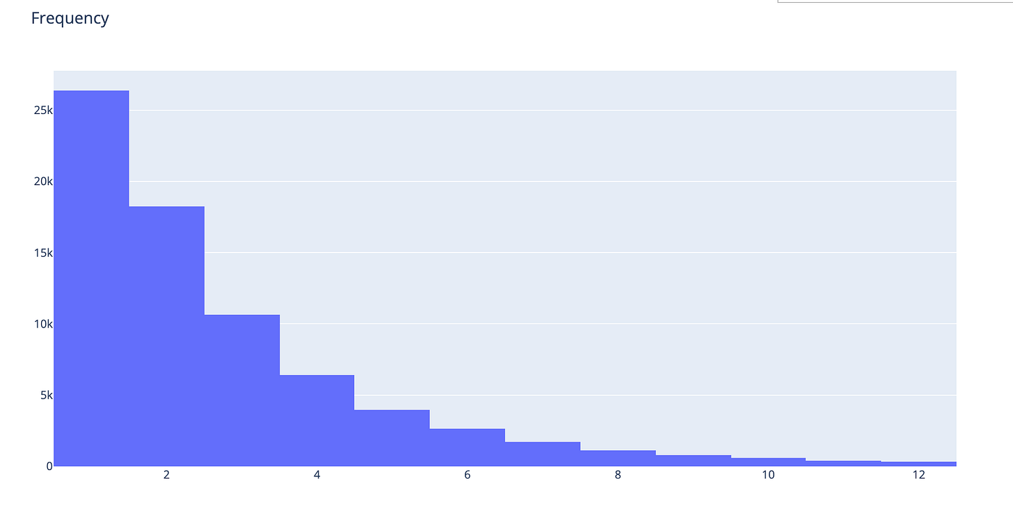 pyoff.iplot(fig)The biggest chunk of users is only making one booking. And we see a decreasing trend as expected.