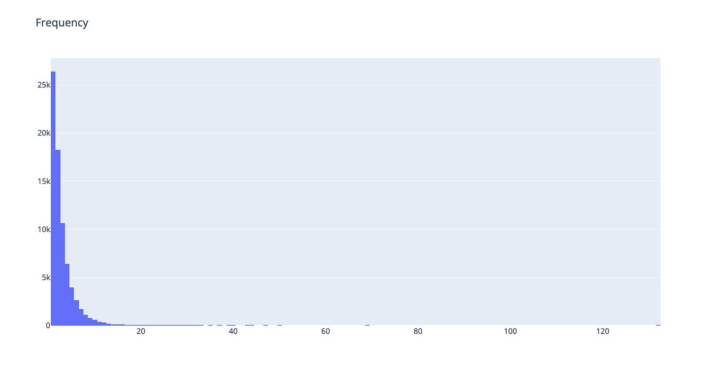 This gives a clear picture of booking frequency. The average is 2.87, while the median stands at 2. Maximum is 132 (probably it is the founder/CEO of the company :)