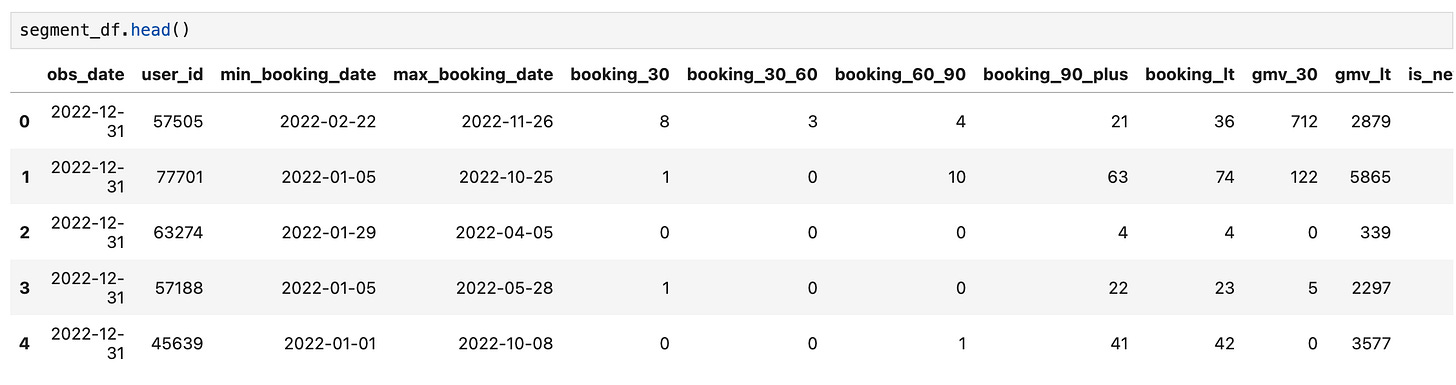 segment_df = fetch_data(query)It looks good. We can continue analyzing the numbers. First, we will create a dataframe that only contains the Active Users (users with a booking in 30 days):