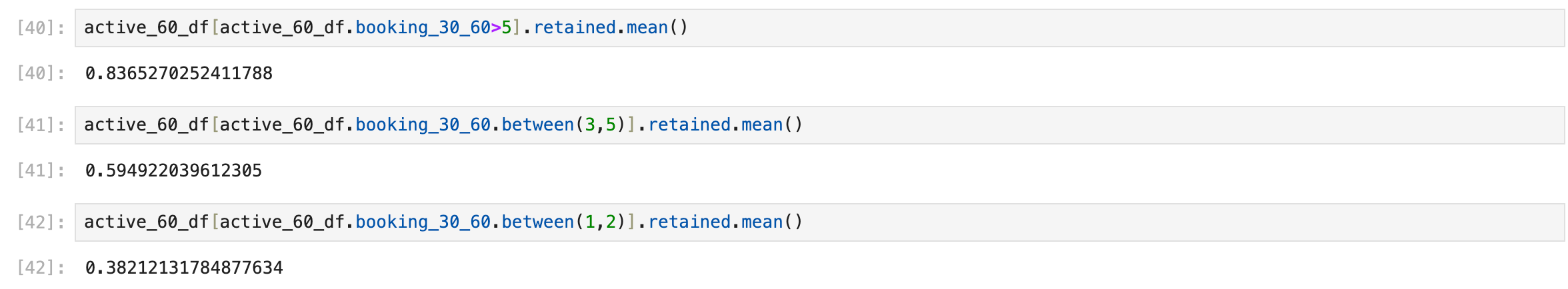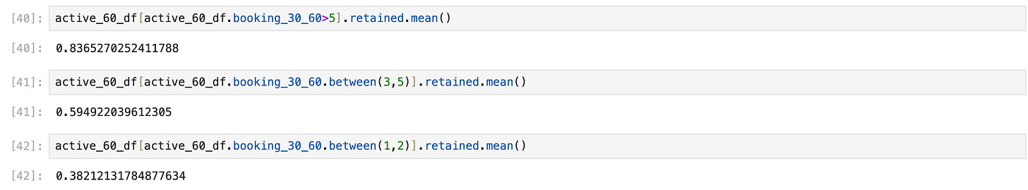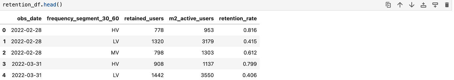 segment_df.loc[segment_df.booking_30_60 >= 5,'frequency_segment_30_60'] = 'HV'To calculate the retention rate inside the dataframe based on these segments, we should do the following:
