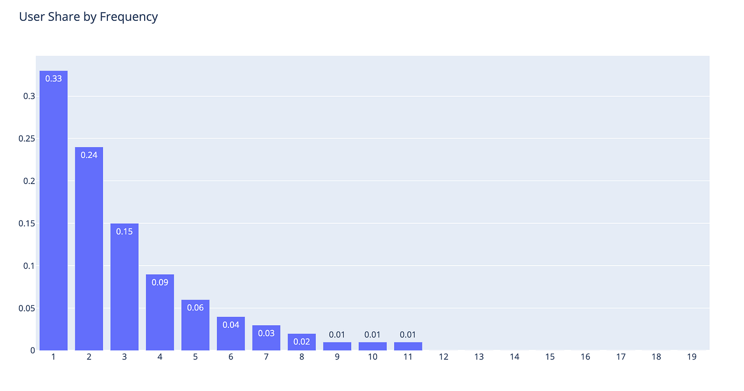 users_by_freq['user_share'] = np.round(users_by_freq['user_id']/users_by_freq['user_id'].sum(),2)and plot it: